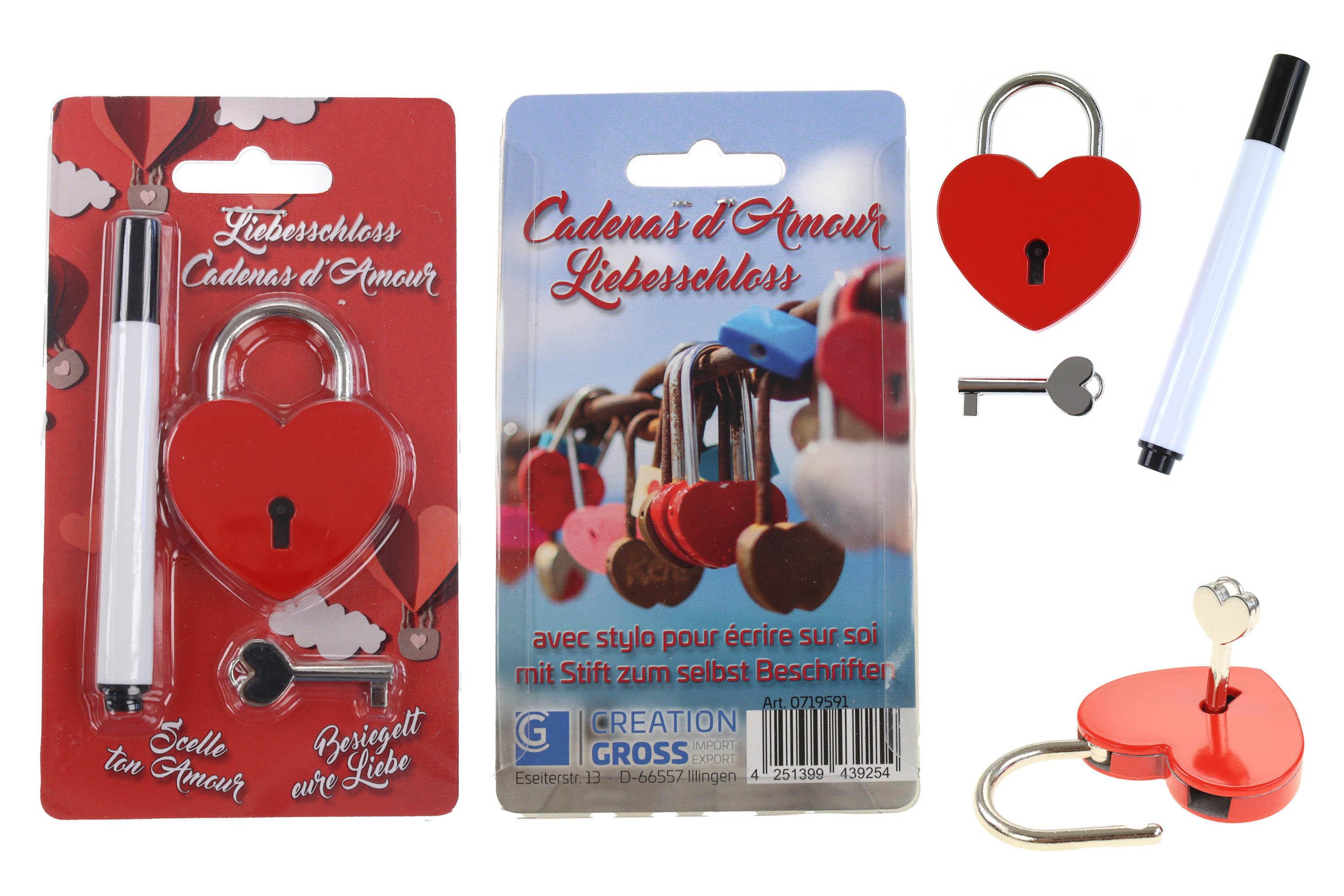 Liebesschloss, Herzschloss in Rot zum selbst beschriften, mit Schlüssel und Stift, 4,5cm