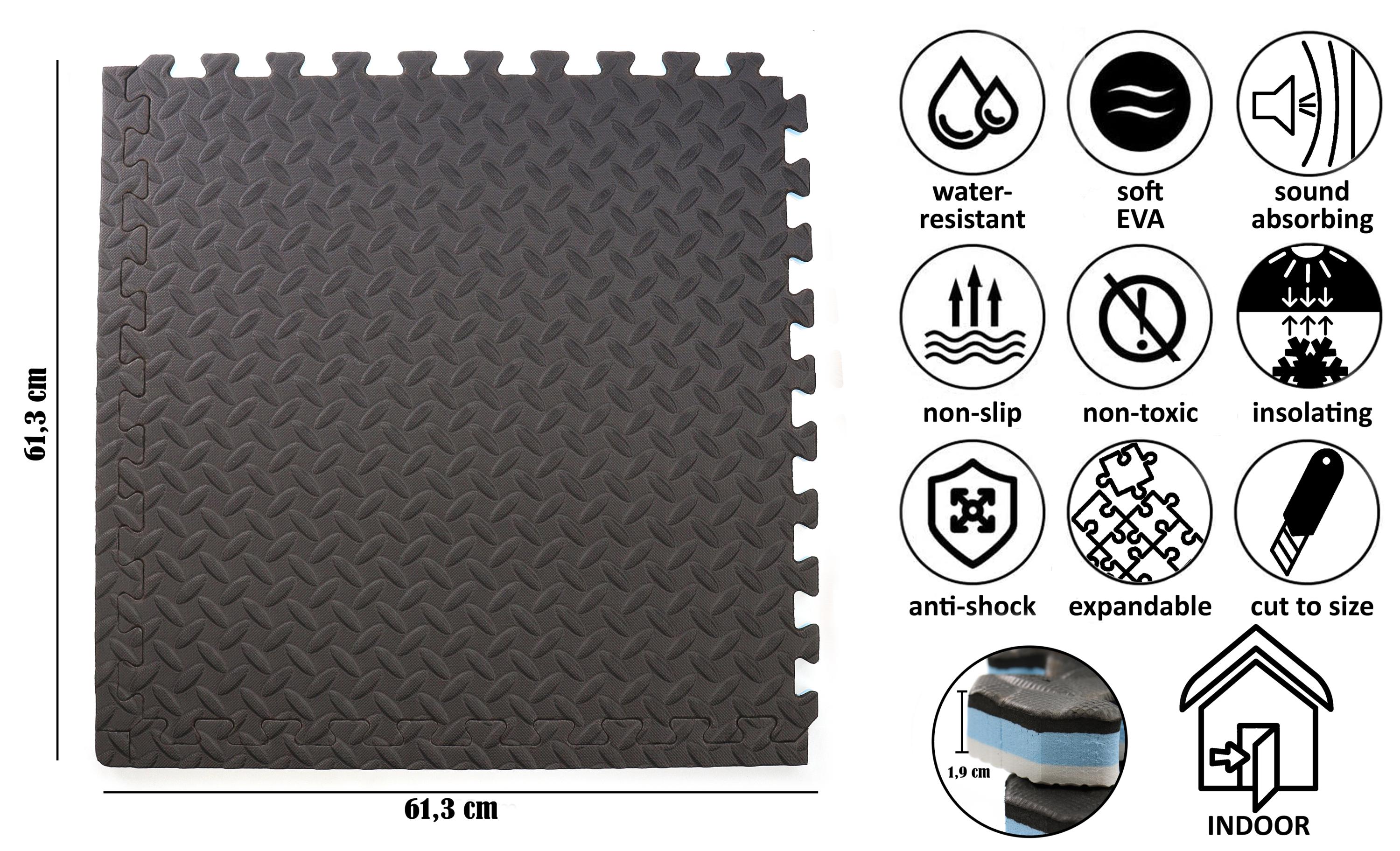 - UNENDLICH ERWEITERBAR: Durch die Puzzleeigenschaft lässt sich das Mattenset beliebig erweitern & ist so für kleine und große Räume gleichermaßen geeignet. Die Randstücke sind abnehmbar, wodurch die Matten individuell in unterschiedlichsten Kombinationen zusammengesteckt werden können. Mit einem Teppichmesser können die Matten individuell zugeschnitten werden. Es handelt sich um Wendematten, daher können sie auf der schwarzen & weißen Seite verwendet werden.