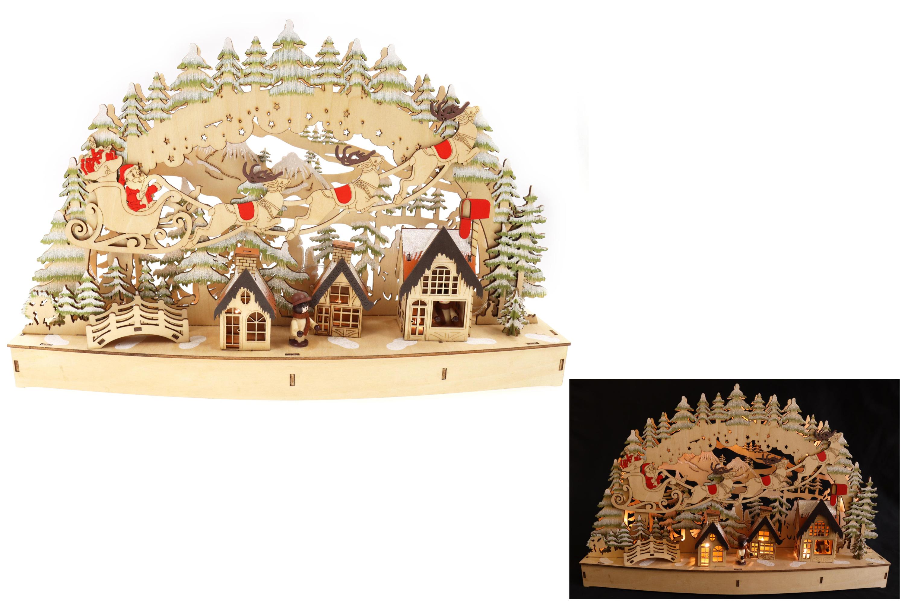 Produktinformationen "Holzschnitt Lichterbogen, Weihnachtsmann mit Schlitten, Glitzer, 45*9*29cm"
