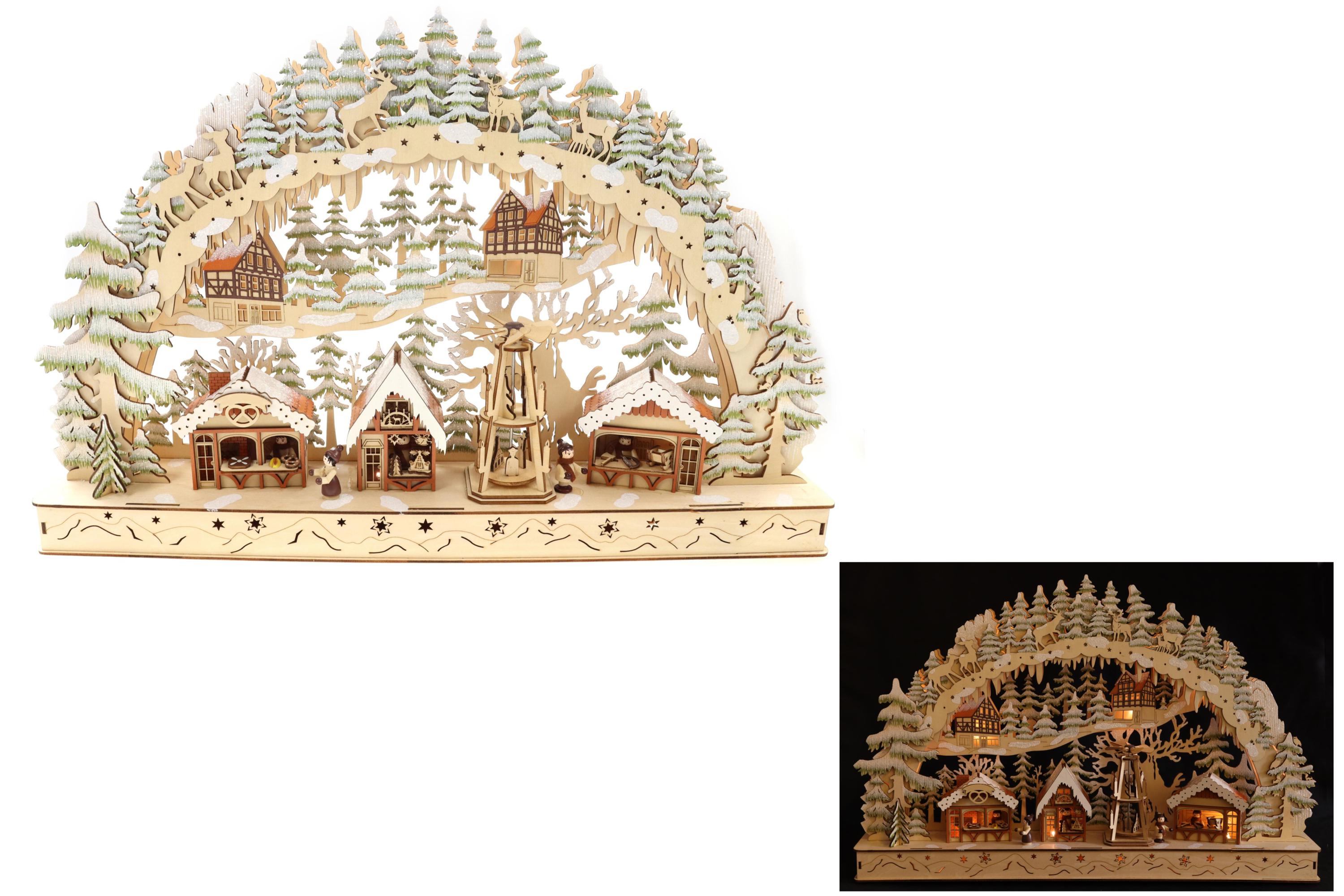 Weiterführende Links zu "Holzschnitt Lichterbogen, drei Verkaufsstände, Glitzer, 60*10*39cm"