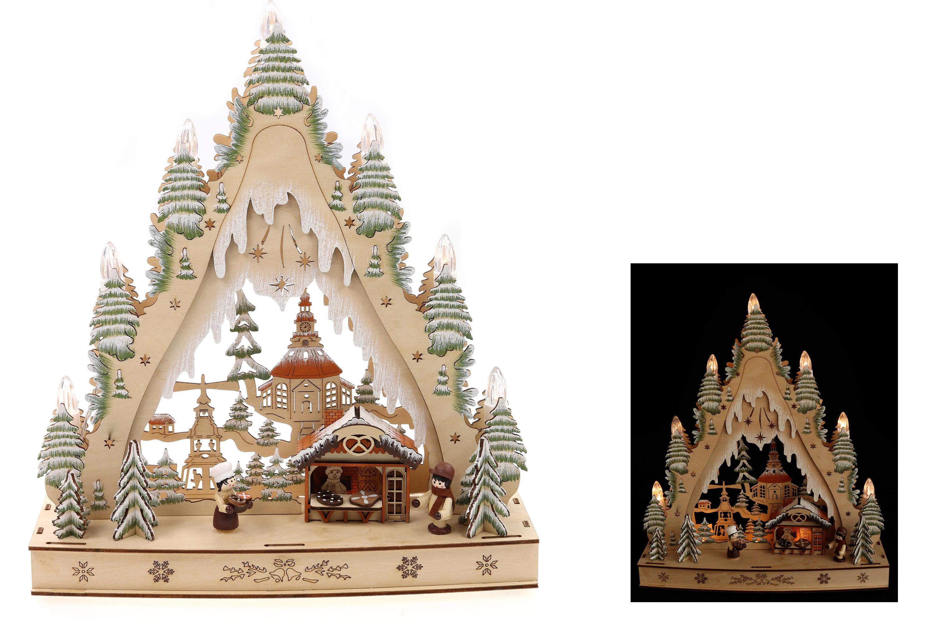 3D Schwibbogen Lichterspitze Holzschnitt Weihnachtsmarkt aus Holz zum Stellen mit Licht 30*8,5*35cm batteriebetrieben mit On-Off Schalter, Timer Funktion (6h On/18h Off)