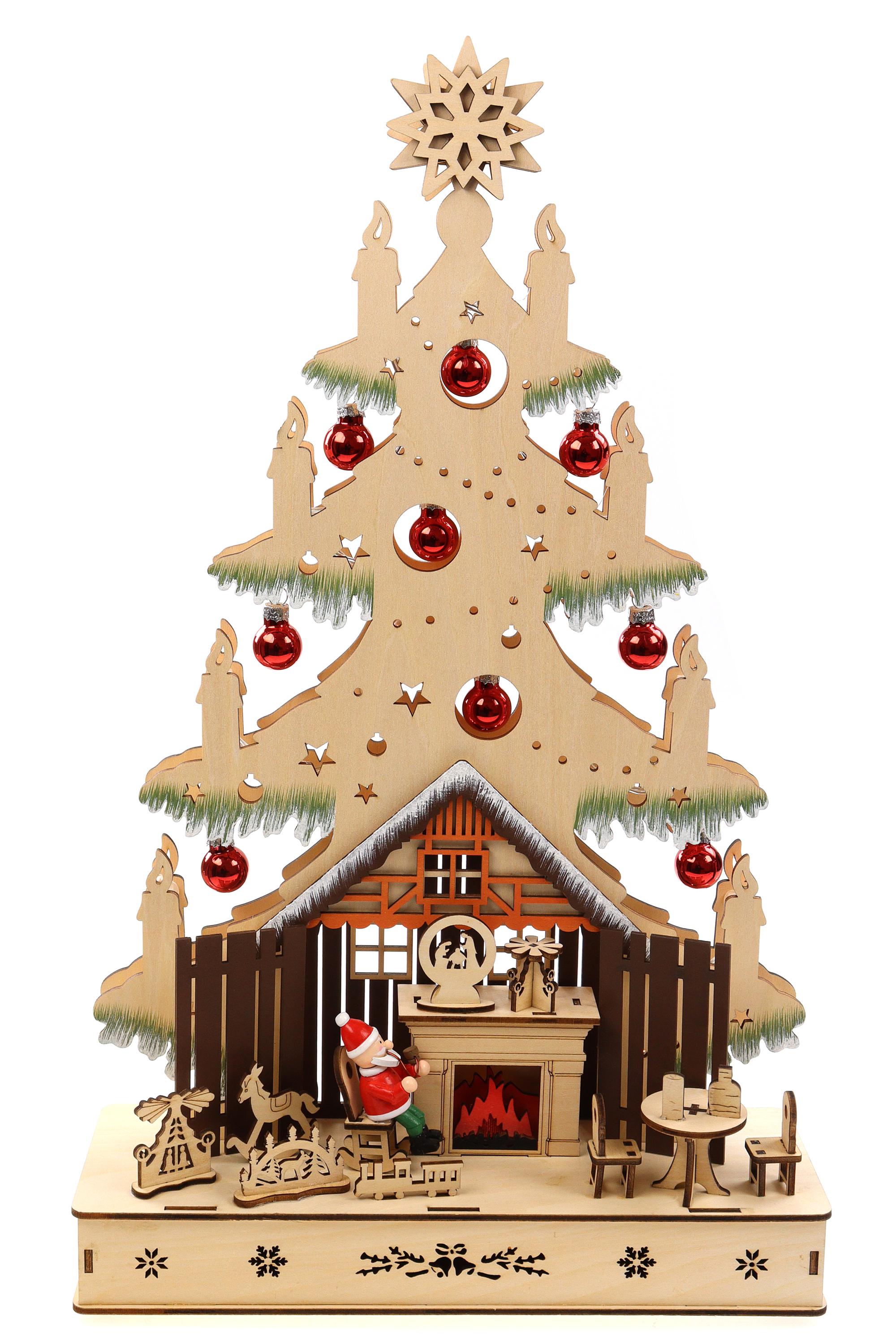 Produktinformationen "3D Lichterspitze Holzschnitt als Tannenbaum aus Holz mit roten Christbaumkugeln zum Stellen mit Licht 30*10*49,5cm batteriebetrieben mit On-Off Schalter, Timer Funktion (6h On/18h Off)"